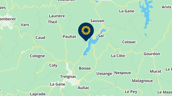 Von Limoges: 93 km - Autobahn A20 – Ausfahrt 43, D20 Richtung Meillards, Chamberet und D16 bis Treignac.