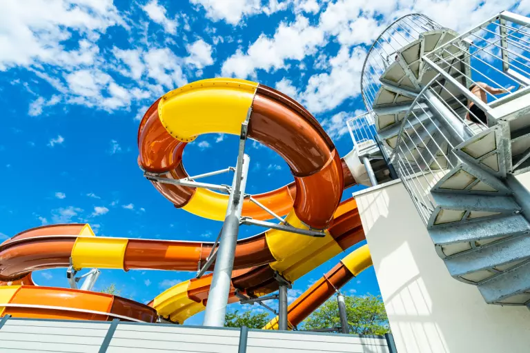 • Beheizter Außenbereich – mit einem großen Pool, drei Rutschen und einem Planschbereich für Kinder bis etwa 8 Jahre.
