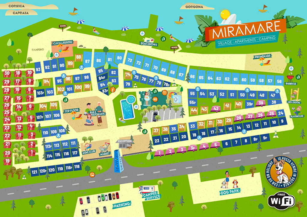 Bar und Restaurant - Genießen Sie die Spezialitäten der Toskana mit einem herrlichen Blick auf das Meer Swimmingpool - Was gibt es Schöneres als in den Swimmingpool einzutauchen und das Meer zu schmecken? Genau das erwartet Sie im Miramare in Livorno wo unser Swimmingpool mit Meerwasser versorgt wird. Tiere - Miramare ist der richtige Ort für Ihren Urlaub mit Tieren in der Toskana. Ihrer vierbeinigen Freunde sind sowohl in unseren Bungalows als auch in den Stellplätzen willkommen. Spiele - Viel Unterhaltung für mehr oder weniger junge. Miniclub - Sie können Ihre Jüngsten in aller Ruhe erfahrenen und qualifizierten Mitarbeitern anvertrauen, die sie jeden Tag auf andere Art und Weise unterhalten werden. Minimarkt - Obst, Gemüse, Brot, Milch, Wurstwaren und Käse, alles täglich frisch und typisch für die Küche der Toskana. Fahrradverleih - Fat Fahrrad und E-Bike für einen Urlaub in der Natur. Zusätzlich zu den oben genannten Dienstleistungen Miramare bietet viele weitere Annehmlichkeiten: Heiße und kalte Duschen Sportplatz, Camper Service, Wäsche, Trafik, Gratis Wifi, Grill, Gaszylinder Aussenbereich für Hunde.